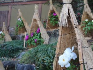 牡丹にわら囲いを設置し、寒さ、霜除けがなされます。